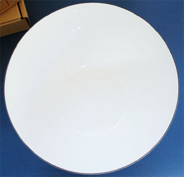 Cond. 特にダメージのない、エクセレントの状態。 ふちに、ほんの些細なエナメルのかけが5〜6箇所ありますが、エナメルボウル特有のもので、傷といえるものではないと考えます。 中も外も擦り傷等なくぴかぴかの状態です。 ※下に敷いた青の色がボウル全体を青っぽくしていますが、実際の地色は真っ白です。