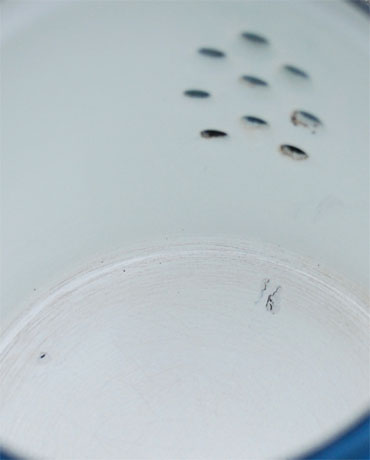 Cond. 大きなダメージのないベリーグッドの状態。 本体ふちにわずかなエナメルのかけ(5mm)と、内側底に使用感があります。 内側底は、スチールたわしのようなものでこすった洗い跡です。 内側底は、また、細いものなどで突いたような傷が3箇所あり(最大のものは、7mm×3mm)、白いエナメルとステンレスがざらつく感じになっています。 また、注ぎ口内側には、コーヒーの渋の跡が頑固についています。 どちらも写真をご参照ください。