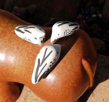小鳥たちは、ヒッポ君と違い、素焼きです。 つるんとした顔、あへっとした顔、それぞれおかしな表情をしています。 (熱狂的な方の間では、この鳥のはずれてしまった一羽でさえ高値でお取引されます)。