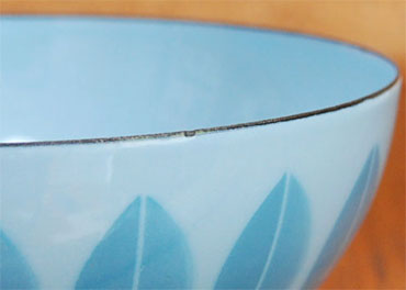 ブルーONブルーきれいなボウル。 使い勝手のよい中サイズです。 欠点らしいものがあるとしたら、上の詳細(や写真のとおり)ほんのわずかなものです。 赤や紫系の果物を盛り付けると、それはそれは..よく映えます。 店主も私物でお気に入りにしている色です。