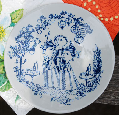 ガーデンパーティの小皿、再入荷です。 今回は、プリントがブルー(紺)です。 素敵にドレスアップの女性と、エスコートの男性。 ウィンブラッドの描く、引き立て役の男性が、個人的にはおもしろいといつも感じます。 ちょっと大仏様のようです。 ランタンの雰囲気も東洋風で、不思議なミックス感と、ノスタルジック感が特徴の一枚です。