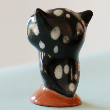ボッセのMajolika時代の作品。 この度、少数ですが入荷しました。 こんな愛らしいの、今までお見かけになったことありますか? 海老茶の土台にちょこんと乗って、きょとん、のふくろうさん。 胸には、白の釉薬がボタンのようにぽつんです。 ボッセ氏、どうしてこんな逆パンダ的なかわいい釉薬にしたのでしょう。 いやいや、好きだな〜に理由なんてないですよね、作者自身が直感を楽しみながら作ったのが、目に浮かぶような一品です。