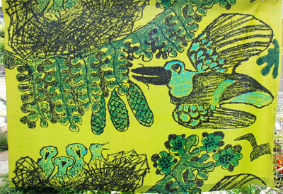 スウェーデンはボラスコットンから、インパクトファブリックの到着です。 タイトル通り、食・母子・与える喜び..など、「生」に直結するモチーフが、力強く描かれています。 そして、グリーンに極太の黒。というところが、更にポジティブです。 でも、よく見ると、どの表情も結構かわいい..。 この’抜き’加減がいいなと思います。 こちらも、デザインはサイニサロネン。 お花を描いたデザインが圧倒的な例を占める中、異色ともいえる、「うまみ」のあるデザインです。