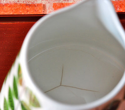本来、とてもレアで人気のベルサの大きなピッチャー(ポット)。 Y字のクラック(ひびわれ)があるため、大きくお値下げしております。 外側にまでは影